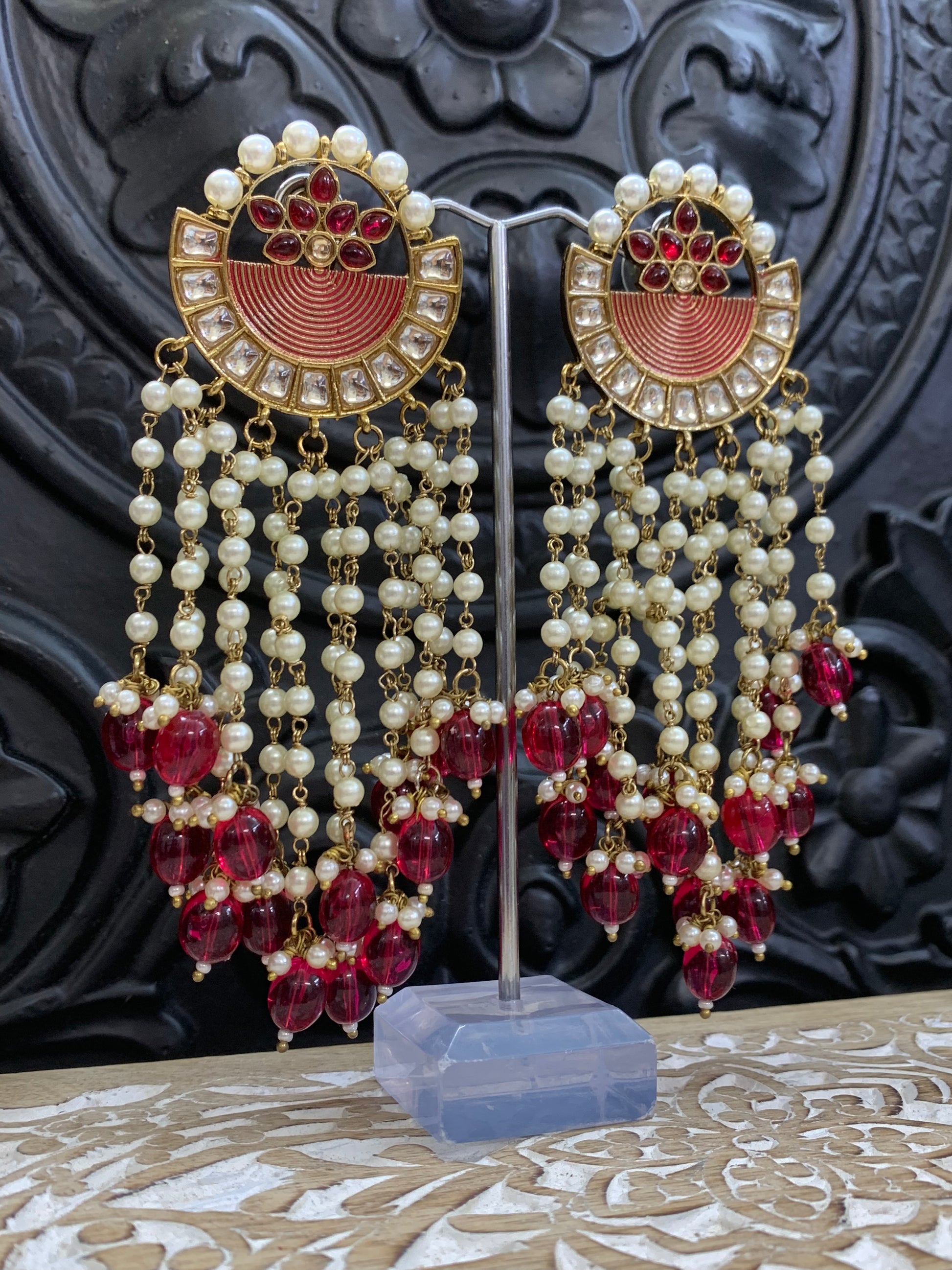 The Amelia Lotus Earring features a combination of Kundan craftsmanship and elegant pearl strands, measuring approximately 5 inches in length. Enhanced with white pearls and kemp stone work, this lightweight design offers a classic traditional aesthetic, suitable for various occasions while ensuring comfort during wear.