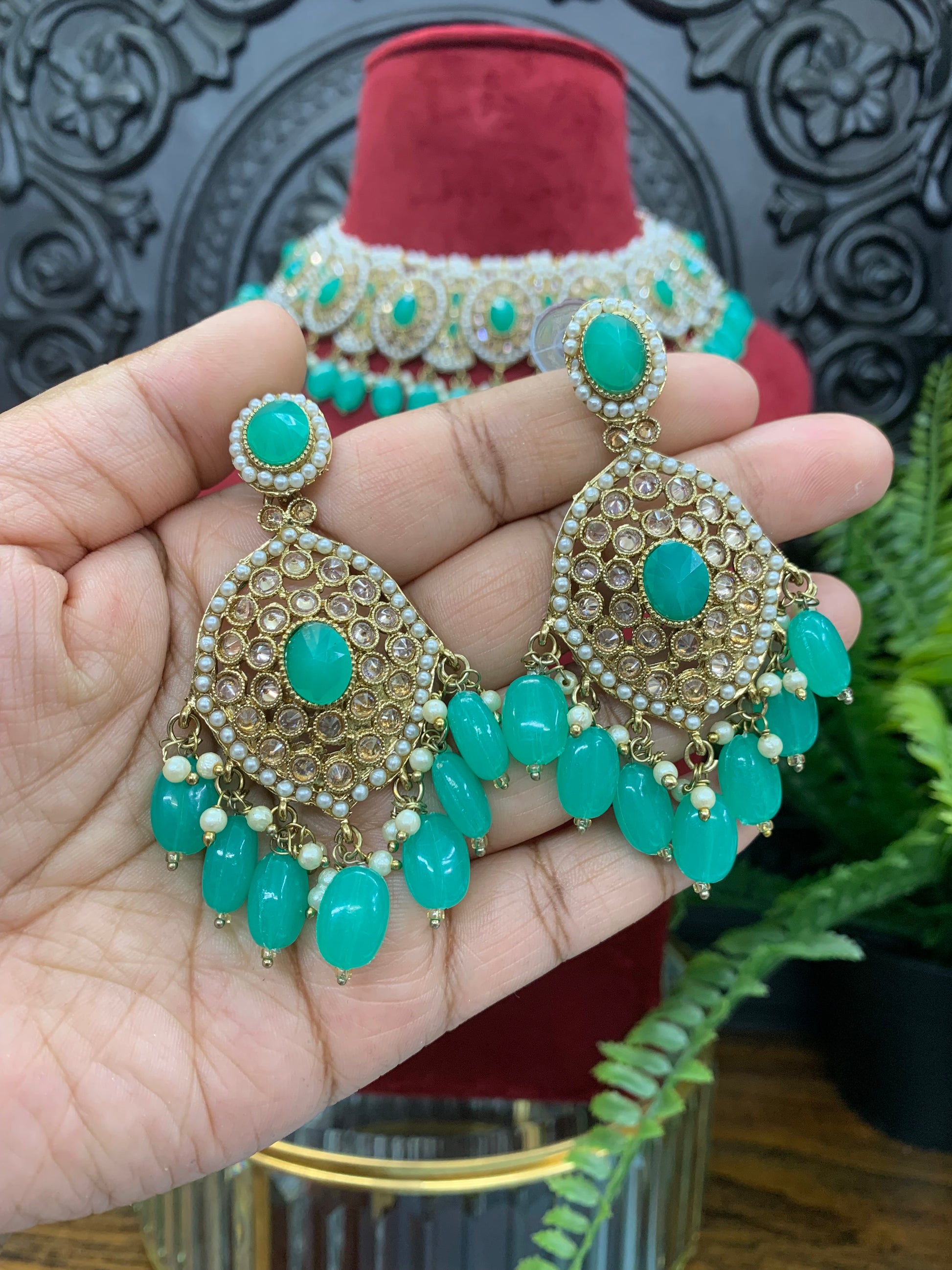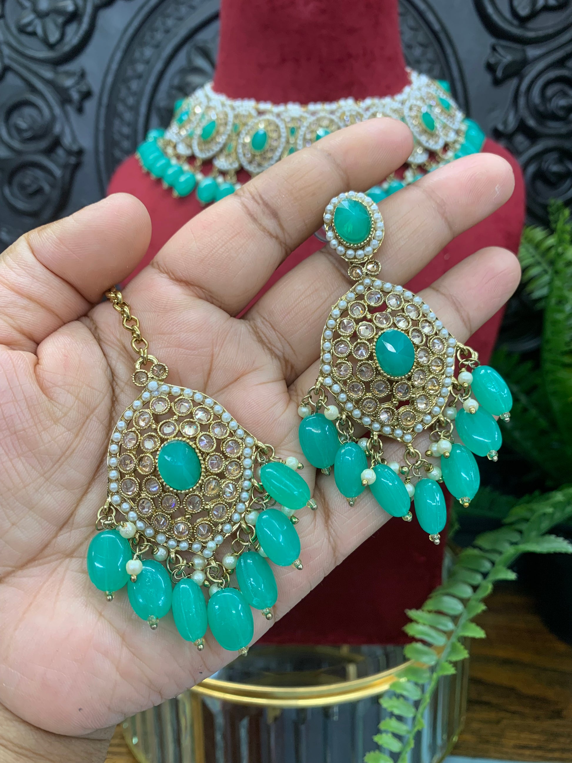 comes with matching Chandbali style Earring and tikka. Full size tikka and earring. About 2.5 inch long earring . Light to the ear . Push back