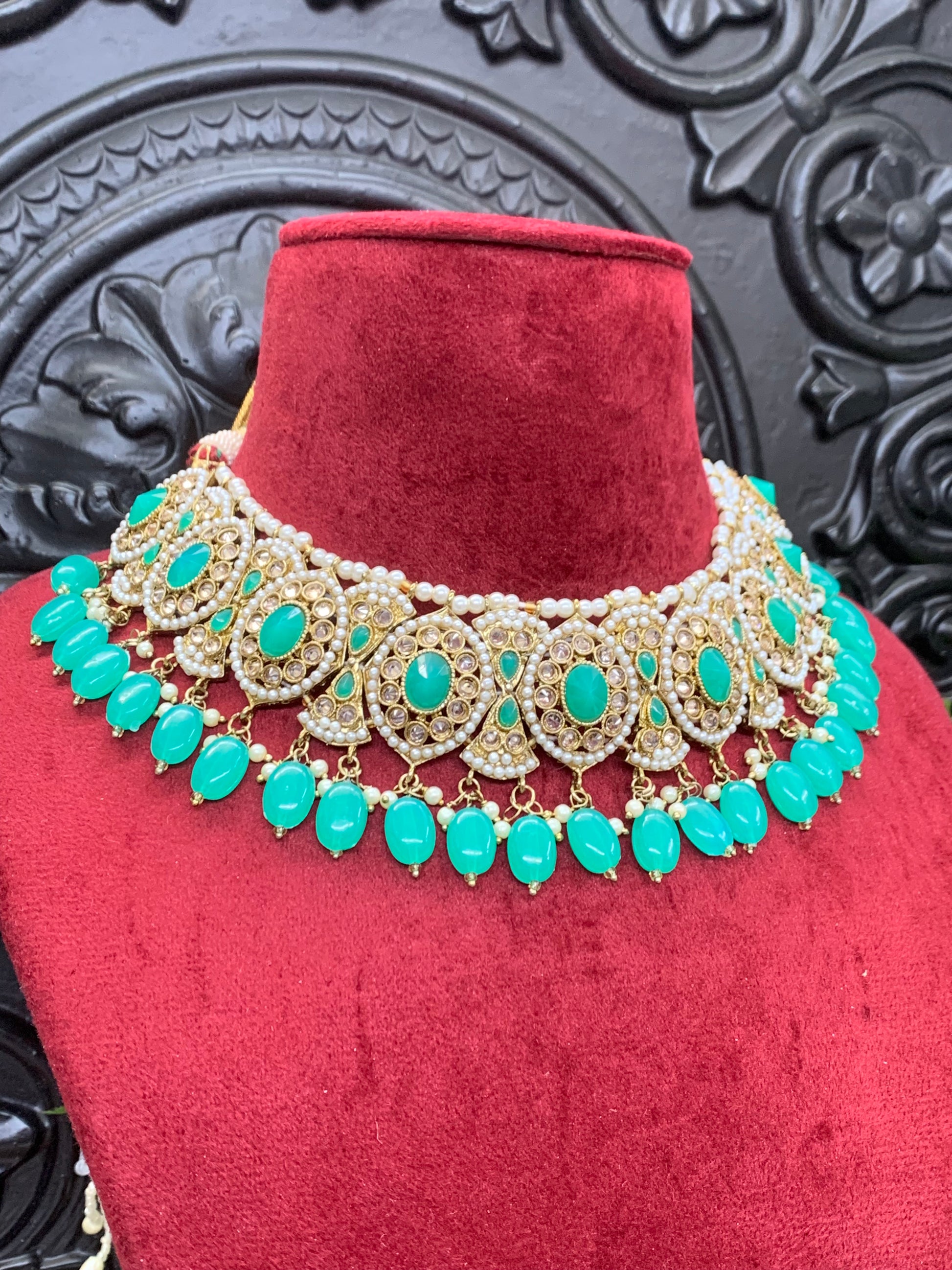 Polki choker necklace antique stone and white pearl turquoise beads